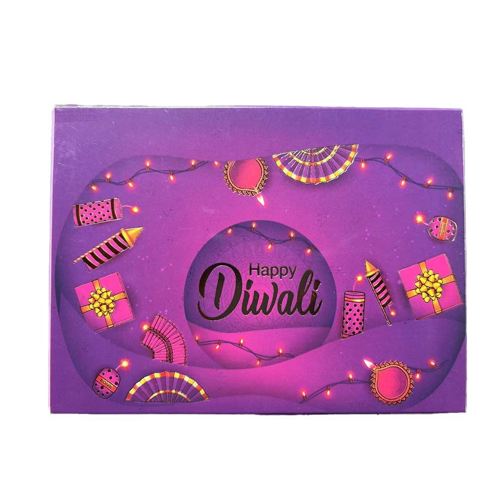 Special Diwali-themed gift box with festive images and premium metallic finish with colorful design.